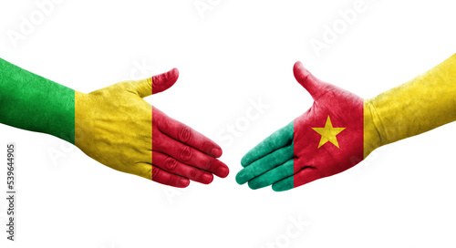Handshake between Mali and Cameroon flags painted on hands, isolated transparent image.