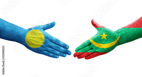 Handshake between Mauritania and Palau flags painted on hands, isolated transparent image.