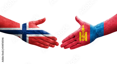 Handshake between Mongolia and Norway flags painted on hands, isolated transparent image.