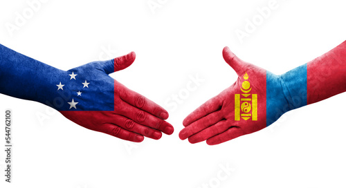 Handshake between Mongolia and Samoa flags painted on hands, isolated transparent image.