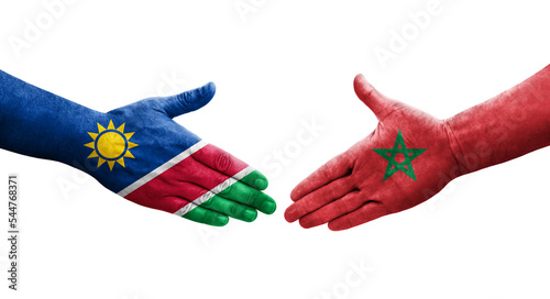 Handshake between Morocco and Namibia flags painted on hands, isolated transparent image.
