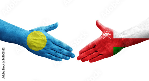 Handshake between Oman and Palau flags painted on hands, isolated transparent image.
