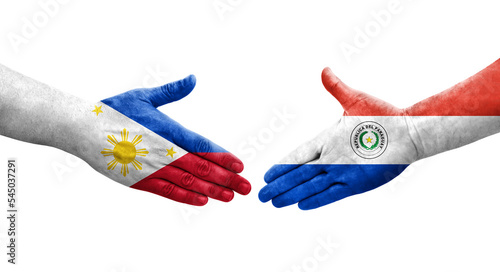 Handshake between Paraguay and Philippines flags painted on hands, isolated transparent image.