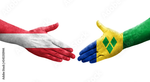 Handshake between Saint Vincent Grenadines and Austria flags painted on hands, isolated transparent image.