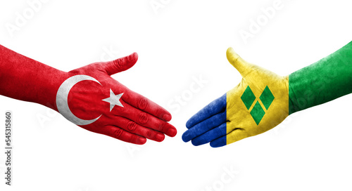 Handshake between Saint Vincent Grenadines and Turkey flags painted on hands, isolated transparent image.