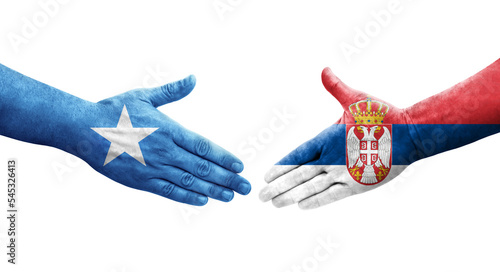 Handshake between Serbia and Somalia flags painted on hands, isolated transparent image.
