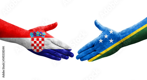 Handshake between Solomon Islands and Croatia flags painted on hands, isolated transparent image.