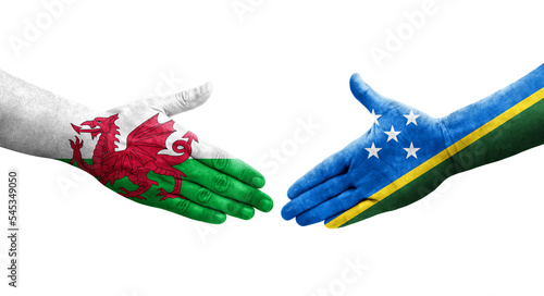 Handshake between Solomon Islands and Wales flags painted on hands, isolated transparent image.