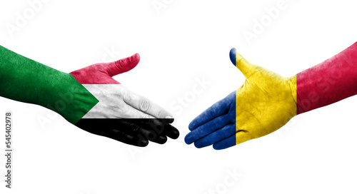 Handshake between Sudan and Chad flags painted on hands, isolated transparent image.