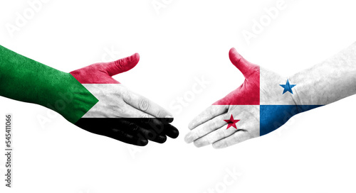 Handshake between Sudan and Panama flags painted on hands, isolated transparent image.
