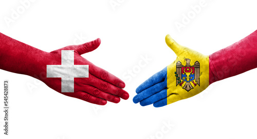 Handshake between Switzerland and Moldova flags painted on hands, isolated transparent image.