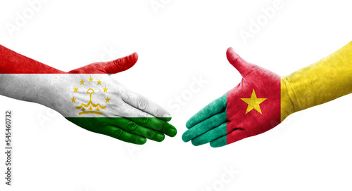 Handshake between Tajikistan and Cameroon flags painted on hands, isolated transparent image.