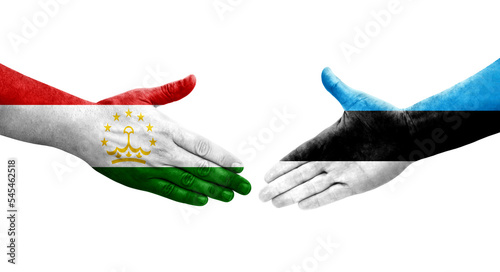 Handshake between Tajikistan and Estonia flags painted on hands, isolated transparent image.
