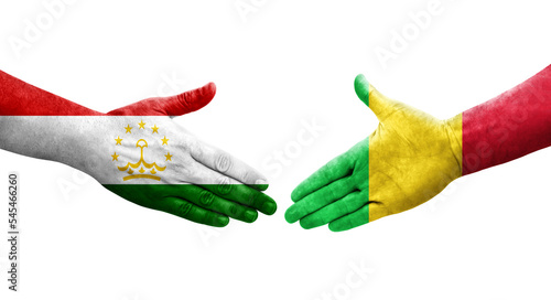 Handshake between Tajikistan and Mali flags painted on hands, isolated transparent image.