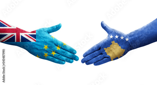 Handshake between Tuvalu and Kosovo flags painted on hands, isolated transparent image.