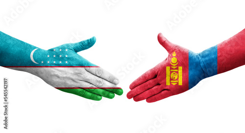 Handshake between Uzbekistan and Mongolia flags painted on hands, isolated transparent image.