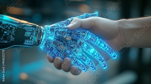 handshake digital, A robotic arm connected to a human arm through digital interfaces, the integration of robotics with human capabilities. the technological connection.