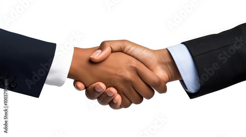 Handshake of Agreement: Two businessmen, one black and one white, shake hands in a powerful symbol of partnership, collaboration, and trust. Their hands are clasped firmly.
