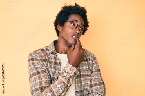 Handsome african american man with afro hair wearing casual clothes and glasses thinking concentrated about doubt with finger on chin and looking up wondering