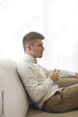 Handsome attractive young guy drinking coffe in the room