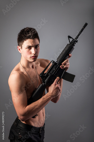 Handsome bare-chested soldier is holding a rifle