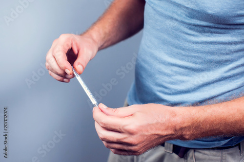 Handsome bearded man in a scarf holding thermometer isolated on a white background. Sad concerned guy is ill and looks at the thermometer, he has a temperature. Medicine concept