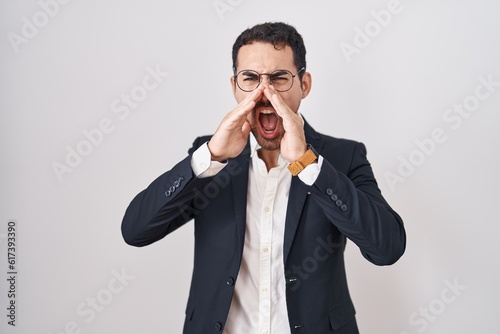 Handsome business hispanic man standing over white background shouting angry out loud with hands over mouth