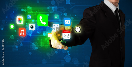 Handsome businessman pressing colorful mobile app icons with bok
