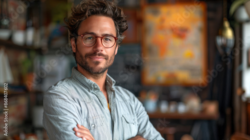Handsome Businessman Smiling Confidently in Cafe Setting