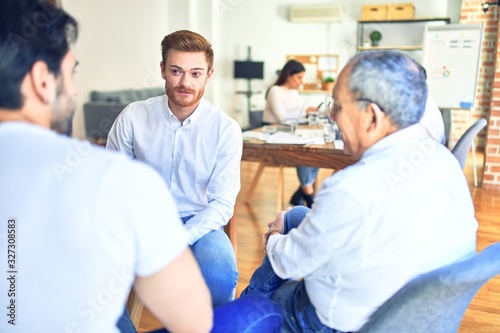 Handsome businessmen smiling happy. Sitting with smile on face speaking taking rest at the office