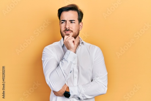 Handsome caucasian man with beard wearing business white shirt thinking concentrated about doubt with finger on chin and looking up wondering