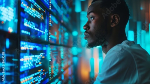 Handsome confident black man, programmer, IT specialist dealing with software, coding, cybersecurity surrounded by large digital computer screens in the System Management Center