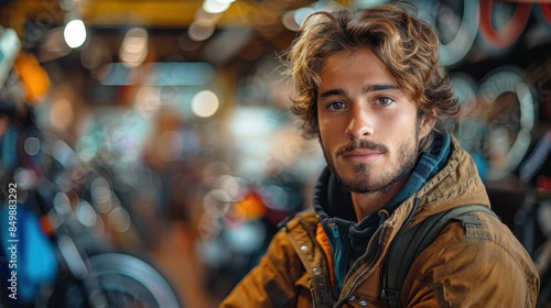 Handsome curly-haired man in outerwear standing in a bicycle shop with a confident pose