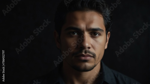 handsome hispanic man looking at camera serious on dark plain black background from Generative AI