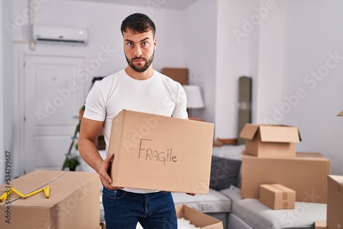 Handsome hispanic man moving to a new home holding fragile box skeptic and nervous, frowning upset because of problem. negative person.