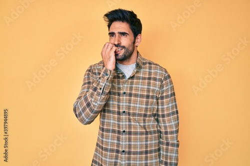 Handsome hispanic man with beard wearing casual clothes looking stressed and nervous with hands on mouth biting nails. anxiety problem.