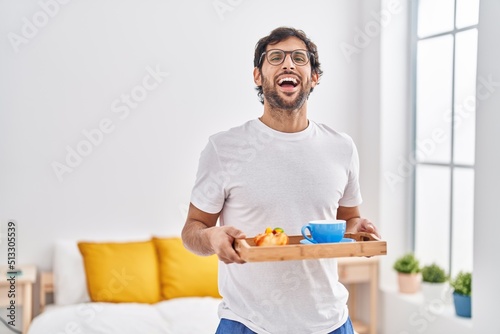 Handsome latin man eating breakfast on the bed smiling and laughing hard out loud because funny crazy joke.