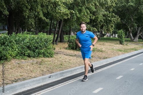 Handsome man jogging in the park. Sportsman runs exercising training outdoors.