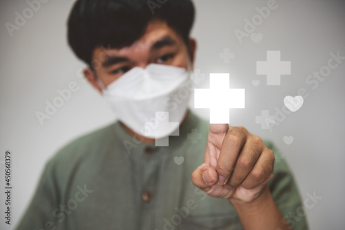 Handsome man wearing a mask touching plus sign icon means assistance to offer positive thing . personal development and health care concept