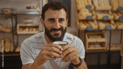 Handsome man with beard enjoying coffee in a bakery shop with bread shelves displayed in the background