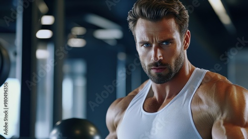 Handsome man working out at a high-end gym with a determined look and sleek surroundings