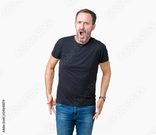 Handsome middle age hoary senior man over isolated background In shock face, looking skeptical and sarcastic, surprised with open mouth
