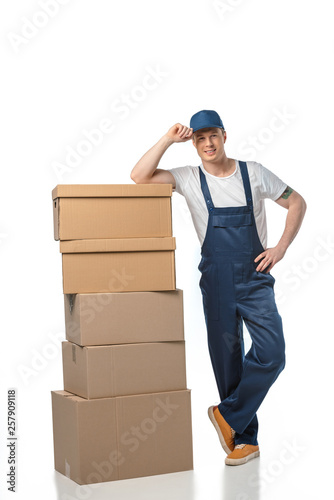 handsome mover in uniform with cardboard boxes looking at camera while adjusting hat isolated on white