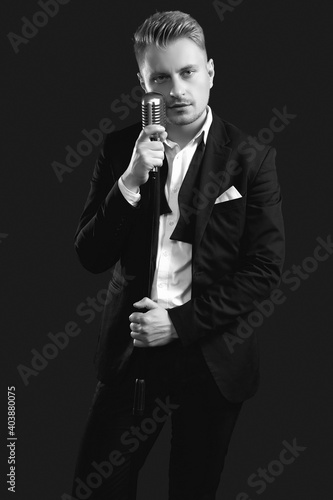 Handsome singer in elegant tuxedo and bow tie with vintage microphone