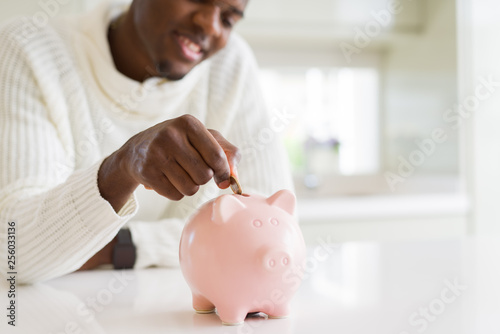 Handsome young african man putting a coin inside piggy bank smiling, excited about investment