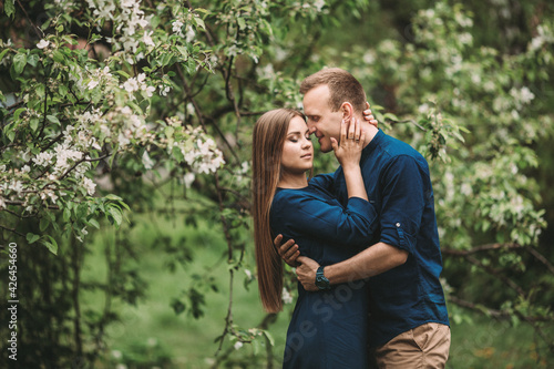 Handsome young guy with a girl stand in the spring garden. Romantic couple are walking in the park. Happy relationship concept