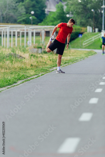 Handsome young man stretching and warming up before for morning workout in the park