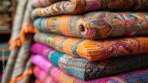Handwoven textiles with intricate patterns, artistic and vibrant, Artisan, Soft hues, Photograph, Handmade craft