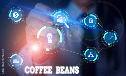 Handwriting text writing Coffee Beans. Conceptual photo pit inside the red or purple fruit often referred as a cherry Woman wear formal work suit presenting presentation using smart device