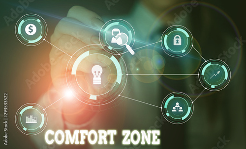 Handwriting text writing Comfort Zone. Conceptual photo place or situation where one feels safe and without stress Woman wear formal work suit presenting presentation using smart device